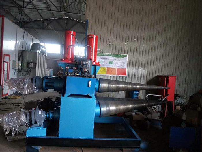 錐形卷板機卷板進程與進程一般都選用強制送料的辦法,靠錐形小口與卷板機前端強制限位擋塊磨擦,迫使錐形大小口成型發(fā)生速度差,到達卷板機上輥的素線一直與錐形坯料的素線重合,完結錐形成型,所以錐形小口下料時有留有錐形小口與卷板機限位擋塊彼此磨損效果的工藝余量。